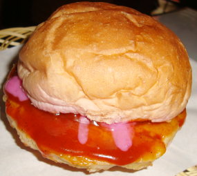 Ayubi Burger terdiri atas roti ubi ungu, probio chicken ubi kuning, dan purple mayo. Ayamnya dilumat bersama ubi kuning dan dibuat menyerupai daging burger yang pipih dan bundar. Rasanya? hmm... lumayan enak juga dan jauh lebih menyehatkan dari burger biasa. Apalagi pasti semua warna ungu tersebut asli berasal dari ubi dan tidak memakai perwarna tambahan apapun.